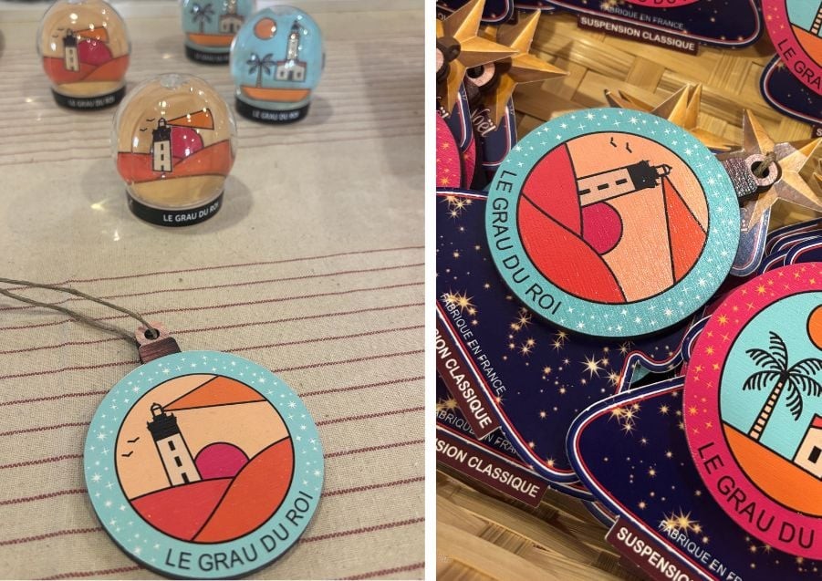 Parmi les best sellers : la boule à paillettes de Noël aux couleurs du Phare de l’Espiguette et la décoration pour mettre sur le sapin, des anti moustiques naturels, de la papeterie en papier recyclé et des paniers gourmands (brandade, vins des sables).